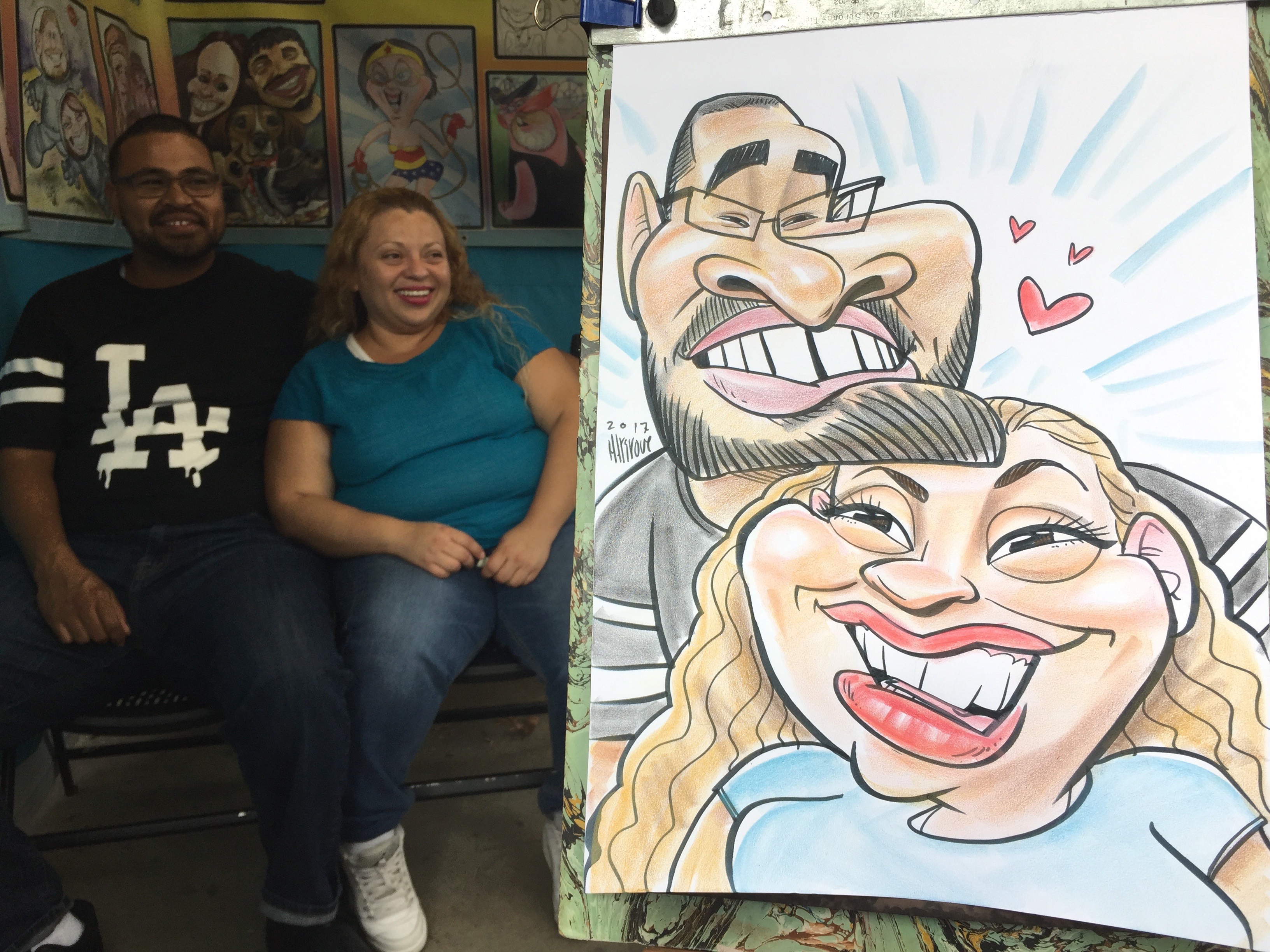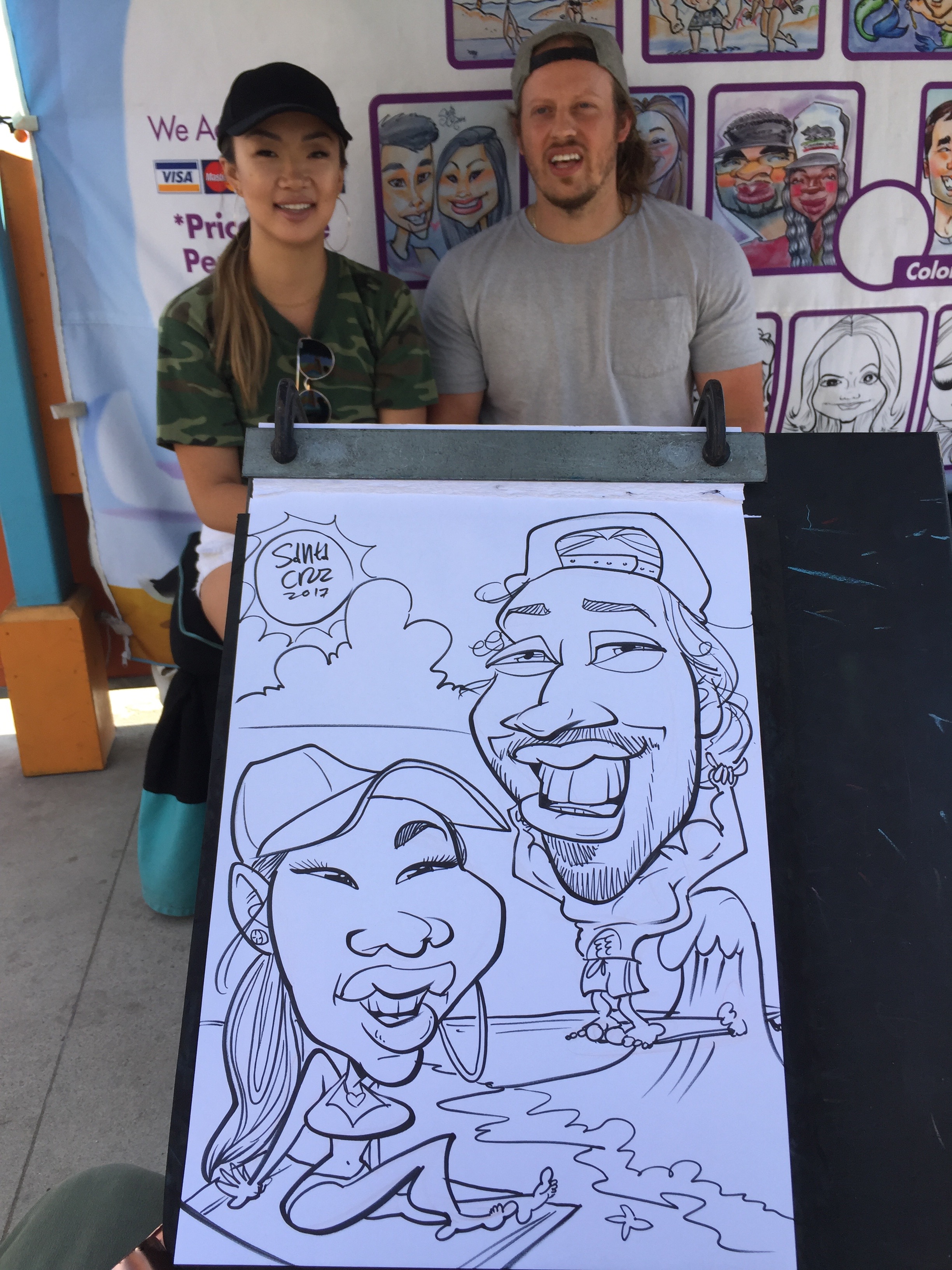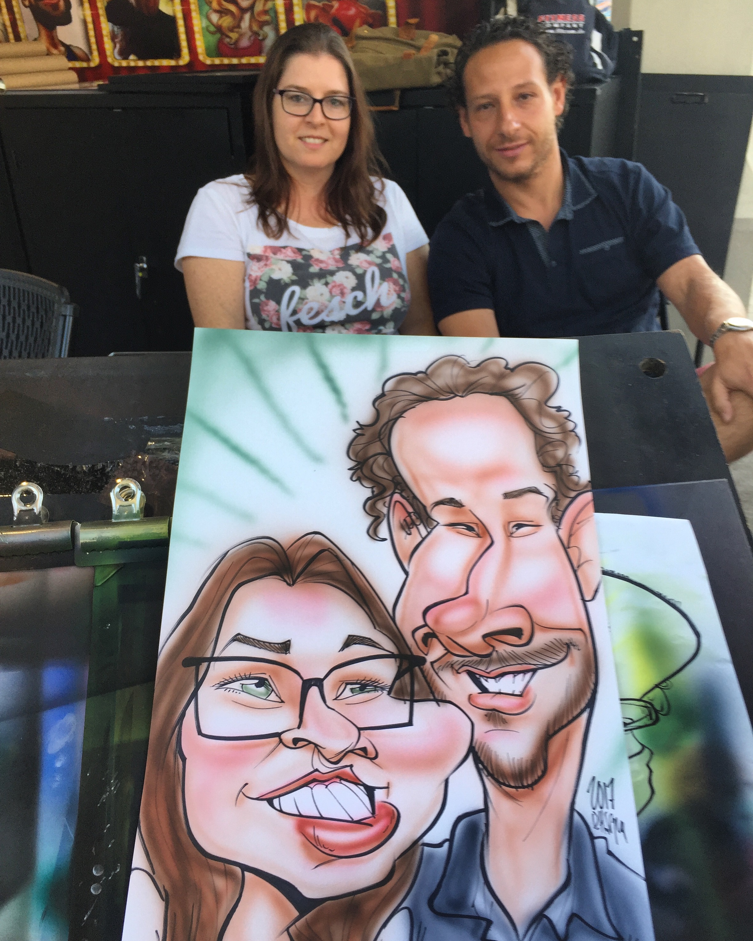 I started drawing caricatures professionally in 2013 on the boardwalks of the Jersey Shore and continued working at State and County Fairs from Florida to New York. In 2016 I moved on to California working at the Santa Cruz beach boardwalk. Located close to Silicon Valley I frequently drew at corporate events for companies like Apple and Google. Eventually moving down to LA to learn airbrush caricatures at Universal Studios Hollywood.